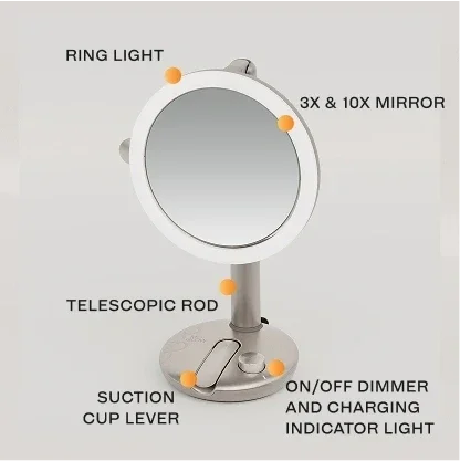 - Use the flip knob on the side of the ring light to choose between 3x magnification for a full-face view, and 10x magnification for precise details.